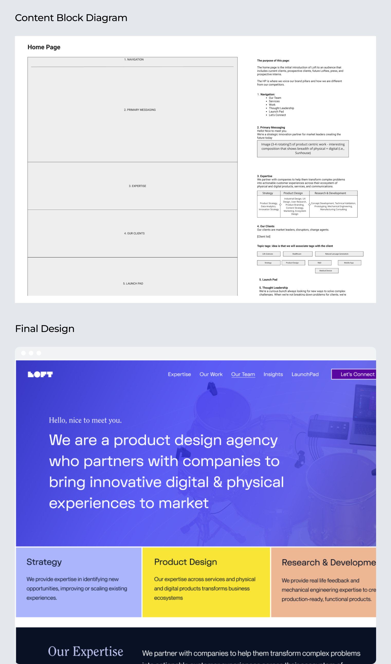 Loft went through a rebrand with two tracks: a new marketing website and an agency reel. I led messaging workshops, shaped the content structure, and storyboarded the reel so the story felt consistent across touchpoints. Both initiatives required a cohesive strategy that balanced brand storytelling with usability and scalability to support future growth.